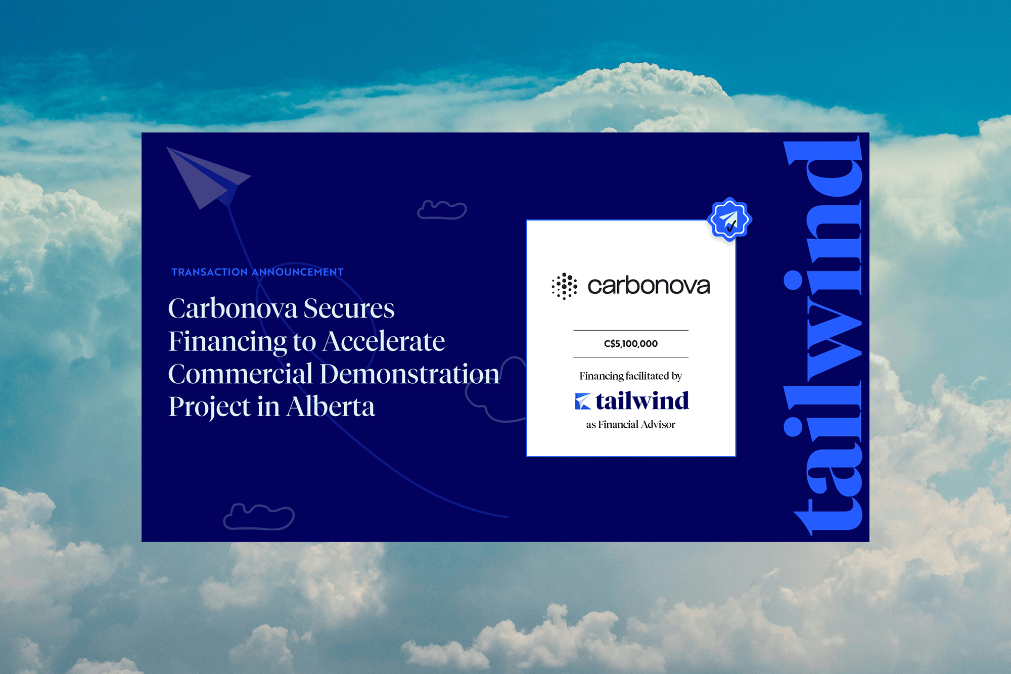 The Company's investor syndicate includes a diverse mix of cleantech-focused funds, industry strategics, and private capital partners who recognized the strength of Carbonova's technology and market opportunity. Tailwind extends its gratitude to all participating investors for their confidence in the company and commitment to building a scalable business to create impact and value.